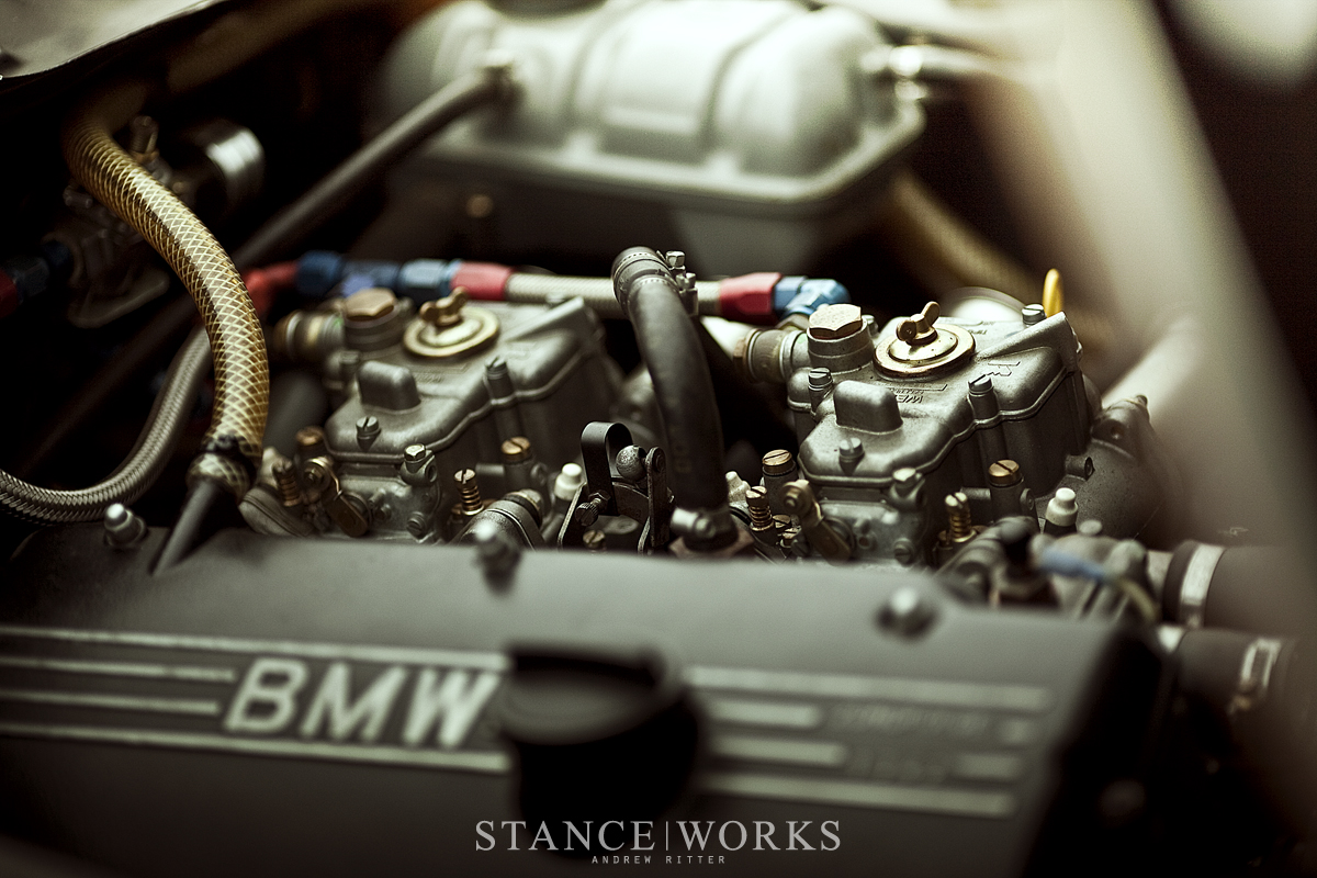 The original M10, as strong as they may be, had grown tired and finally gave up while on the track at a BMWCCA Oktoberfest. PTG wanted to stay true to the original power plant while making minor changes to increase its reliability and ensure that it could continue to have fun on track for years to come. The robust little four cylinder has been enlarged to 2.2 Liters with a bore and stroke of 89.0 x 80.0mm , pumping out 215 Horsepower which is more than enough to kick the back end out and hop the curbs of Laguna Seca. The headers were ceramic coated in a bright white, mimicking many of BMW’s dedicated race engines and cutting down on engine bay heat. Drawing in the cooler air, a set of Weber 45 DCOEs allow the M10 to breathe. PTG’s addition of a new fuel regulator keeps the carbs’ tune steady and ensures that the car is consistently strong around each lap.