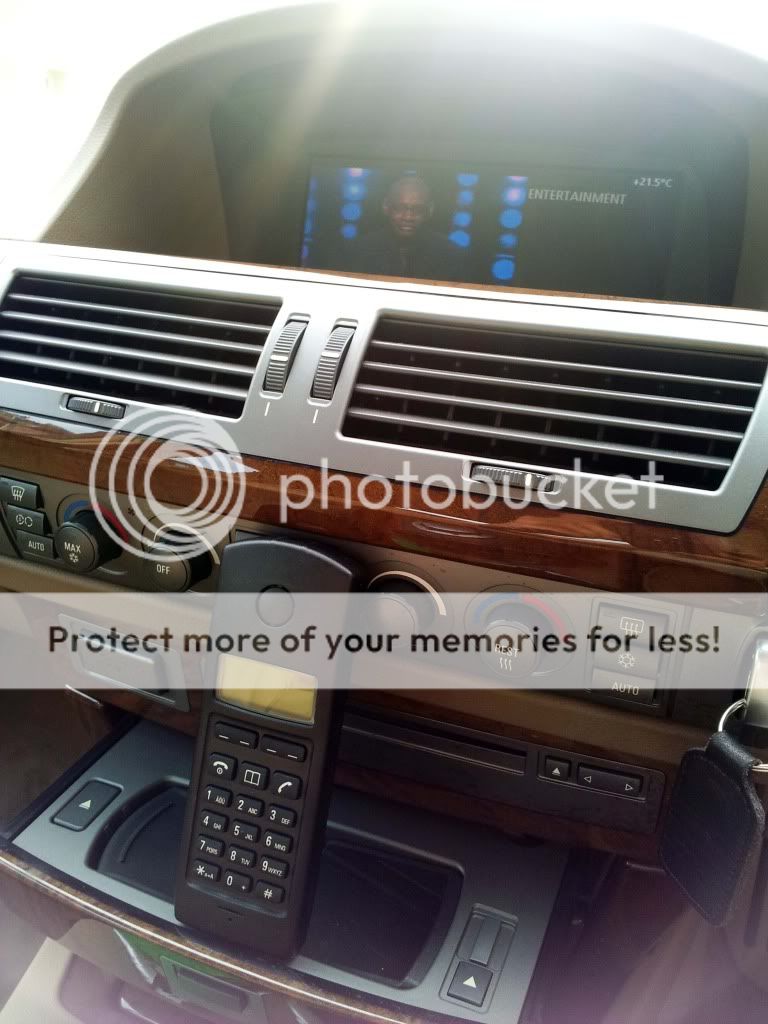 In the front end you have a wireless phone with with direct lines to BMW assistance and and SOS button in the roof hard wired through a facotry hands free kit for both front passengers, above that you have the dual air con with outside smell stopper (yes its a thing), Also infront of the passenger front seat in the dash you have a 6 disk CD changer and another cd/dvd reader in the centre console for filmage etc, the grey square is a pop out dialing pad for the phone