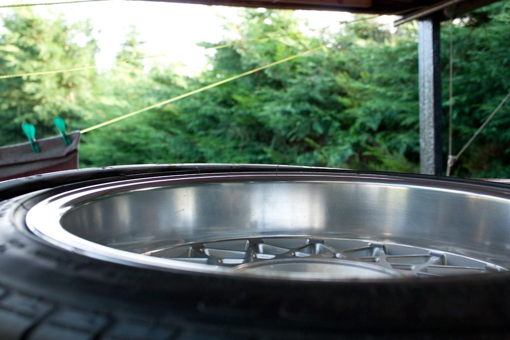 My rear beam is fitted with castor and camber plates so I can adjust either. Today I test fitted the rear beam with a wheel, 16x9 with 225/40 and 215/40 tires, to check for clearance with camber dialed out as much as the plates allow.