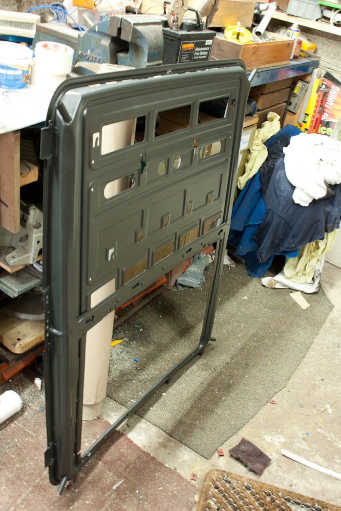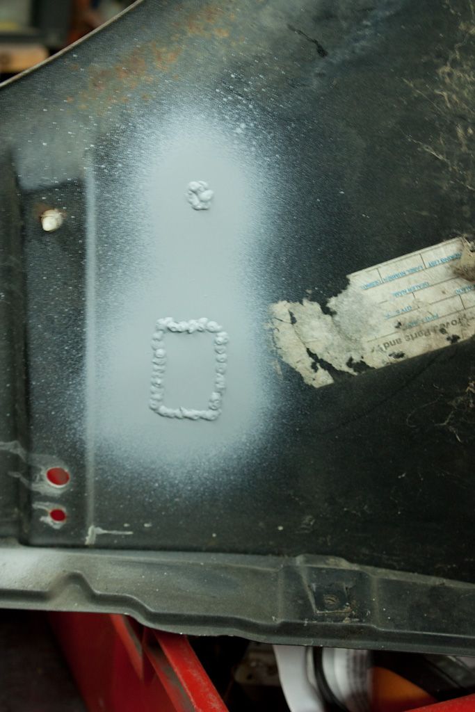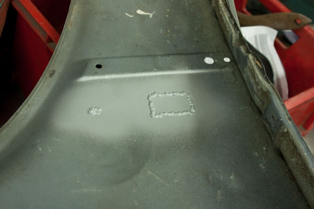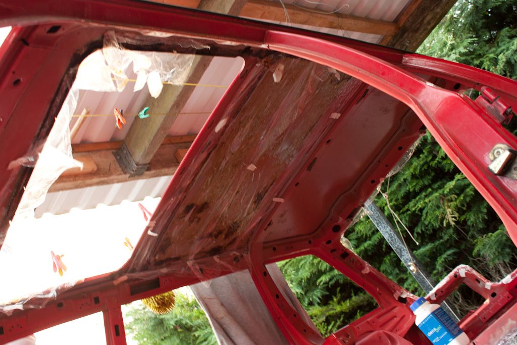 There looked to be some rust around the bumper mounts on the back of the valance, spit of, bolts cut of and only some chipped paint and a little bit of surface rust. When the spit is back on I'll start cleaning back the roof skin for painting and the rest of the interior.