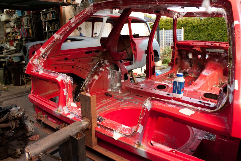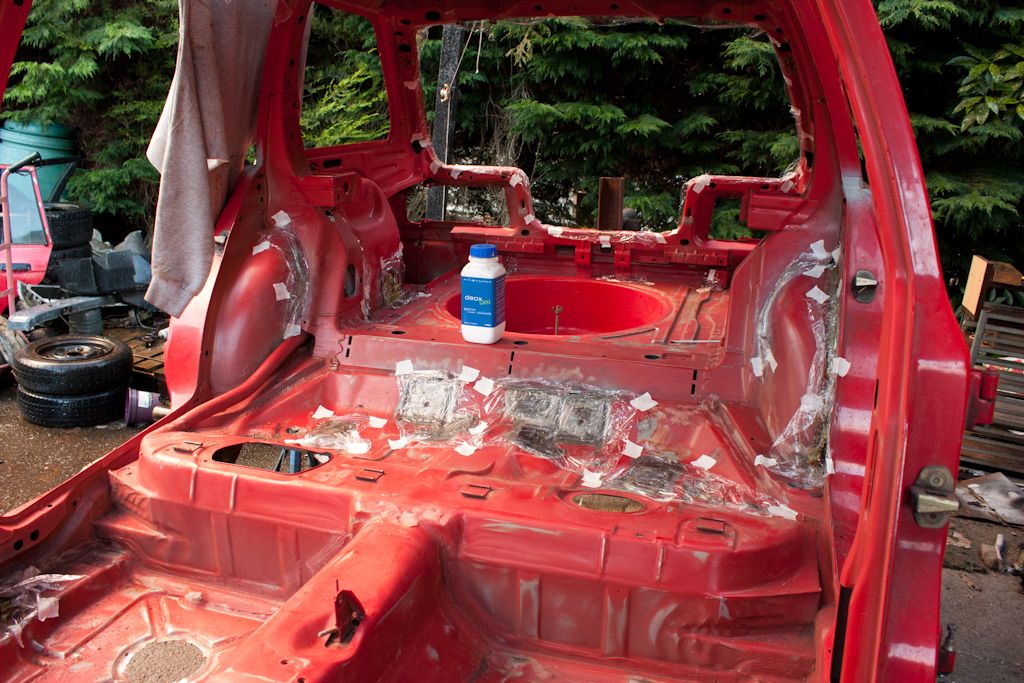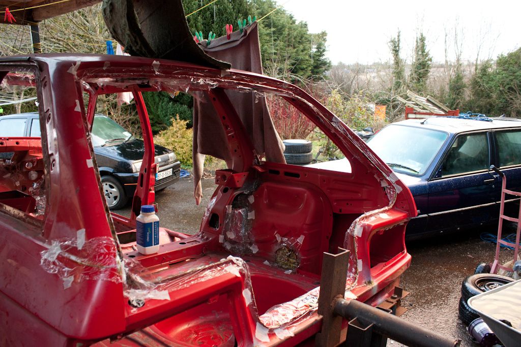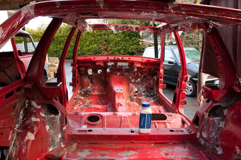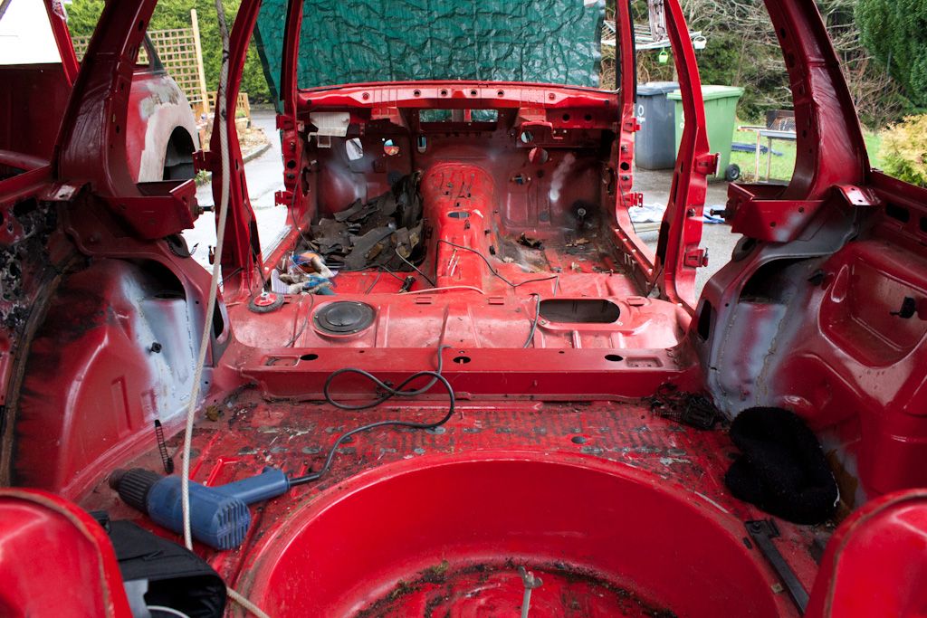 Little bit of progress made this week with the aim being to get the interior painted up (hopefully next week). I started out rubbing down the whole interior during the week, 5 or so afternoons later and the whole floor, boot, pillars and firewall have all been rubbed down with a scotch bright pad. I cleaned back all welded area's so the cheap crappy paint or primer was gone, any scabby area's, surface rust etc all cleaned up and treated with some Deox gel. Because the gel hardens out after awhile I covered it all up with cling film. The boot area was by far the biggest pain to do so far! Lots of shite left over from the sound deadening, dirt and grime all clung to the paint, was messy cleaning it all up and took by far the longest!