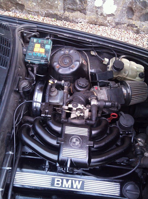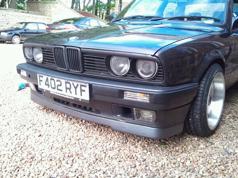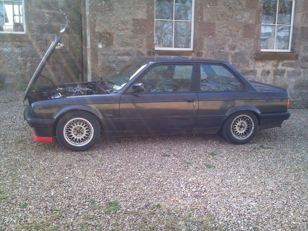 Im Euan and im 19, this is my second car, its also my second E30. The first one I bought turned out to be rotten and a ringer ( stolen identity ) so i decided to break it and give up. I purchased my new car, this time a 316 with a 2.5i motor and superchip a few months ago. On the first day I owned it, it blew up 10 miles from my house, shattering a rocker arm and spliting a piston into 20 pieces. This is the car on the second day i owned it sitting on the standard 15" bbs.
