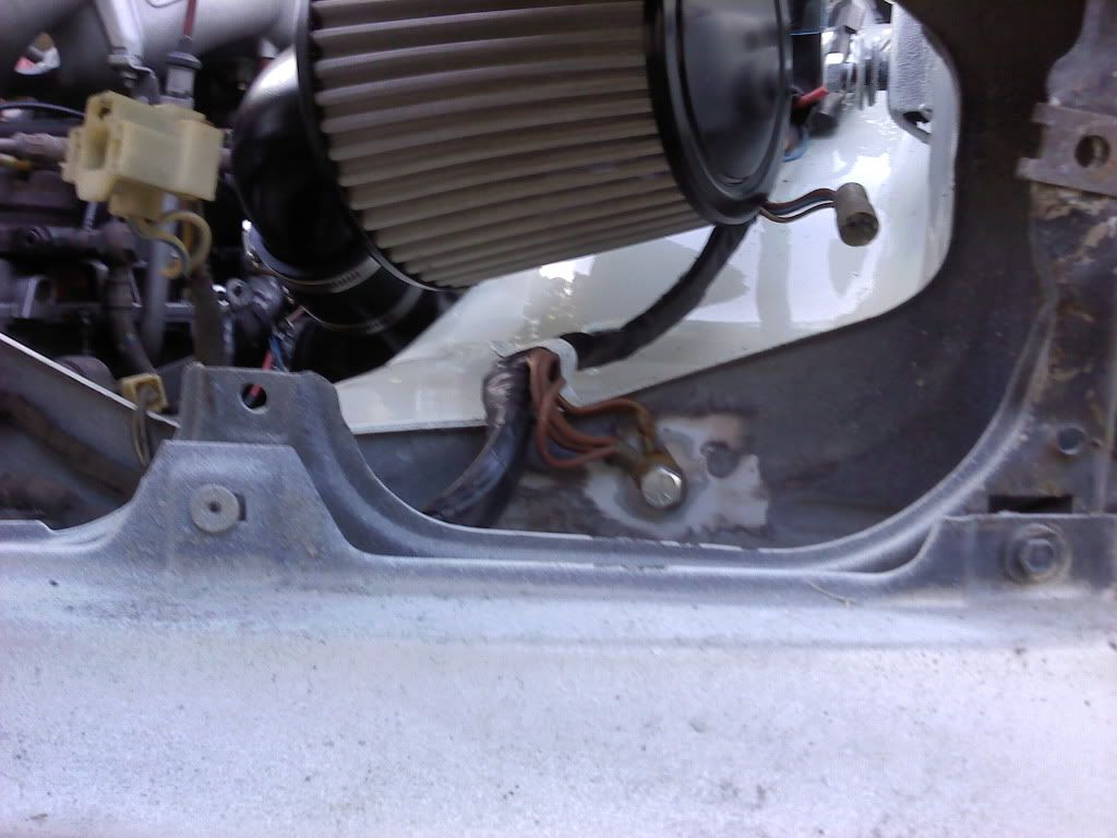 Since my grounds were all on the battery tray, I needed to relocate those, and chose this area under the headlights since it wouldn't require lengthening the wires or drilling into my freshly shaved and painted bay work.