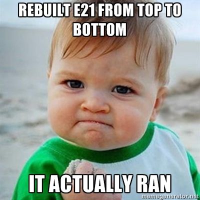After that, it got dark. I basically routed a power wire to the trunk, made a ground wire, hooked up a few loose ends here and there and turned it over. Timing is off, but the engine itself seems to be healthy! Tomorrow I'll be finalizing the battery relocation with the battery box and cutting the wires to length. The "new" radiator (read: new to me, old in reality) I got is actually bad, so I might just spring for an aluminum one to be done with the hassle. Stoked that it ran though, if only for 2 minutes. I think I have a couple ground issues to track down as my tach and low beams weren't working. Minor stuff though. Should be on the road again soon!