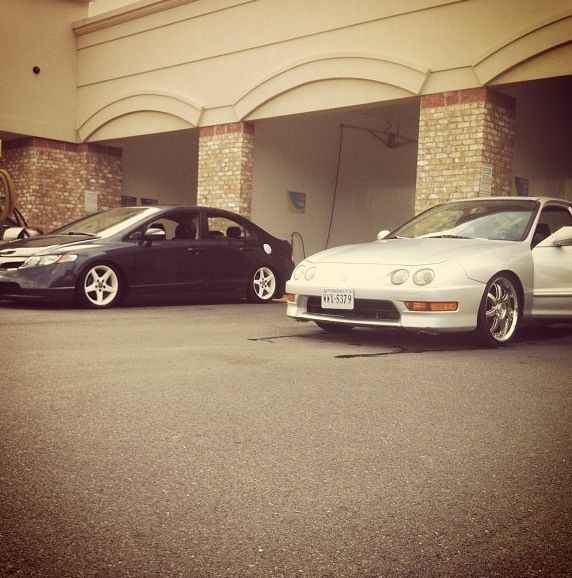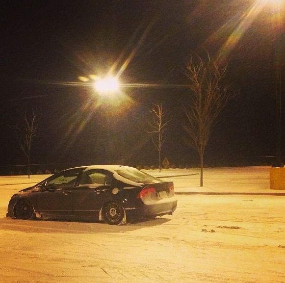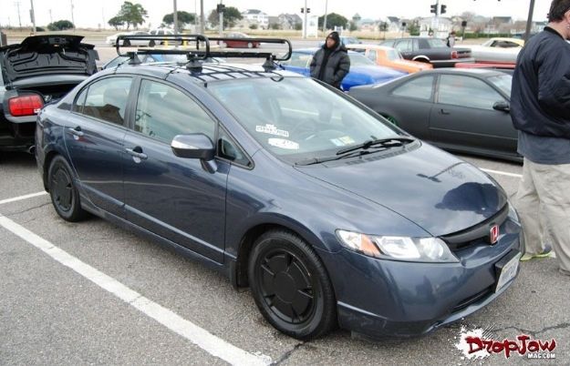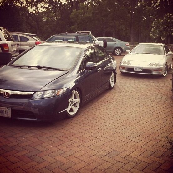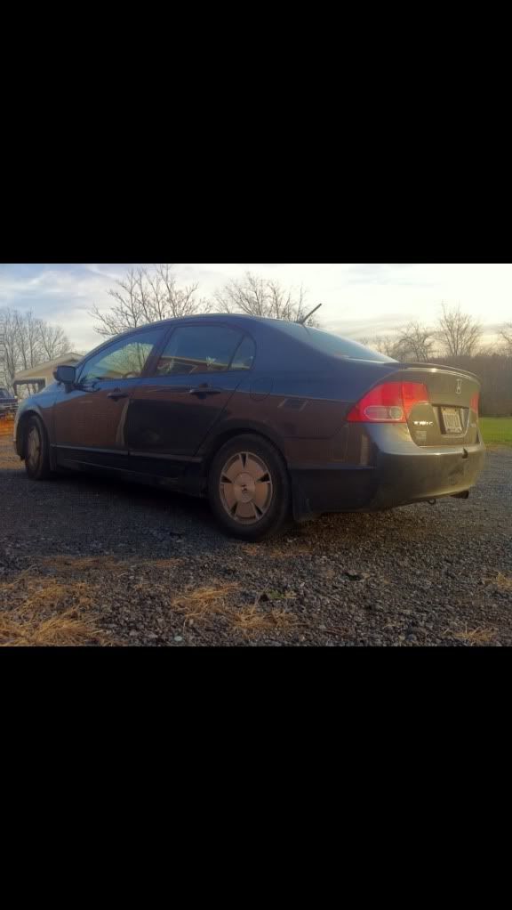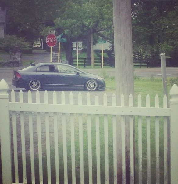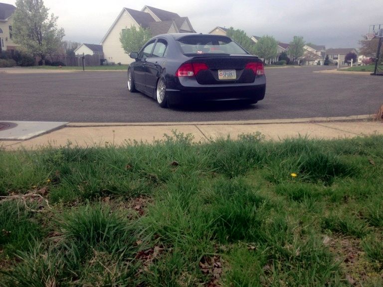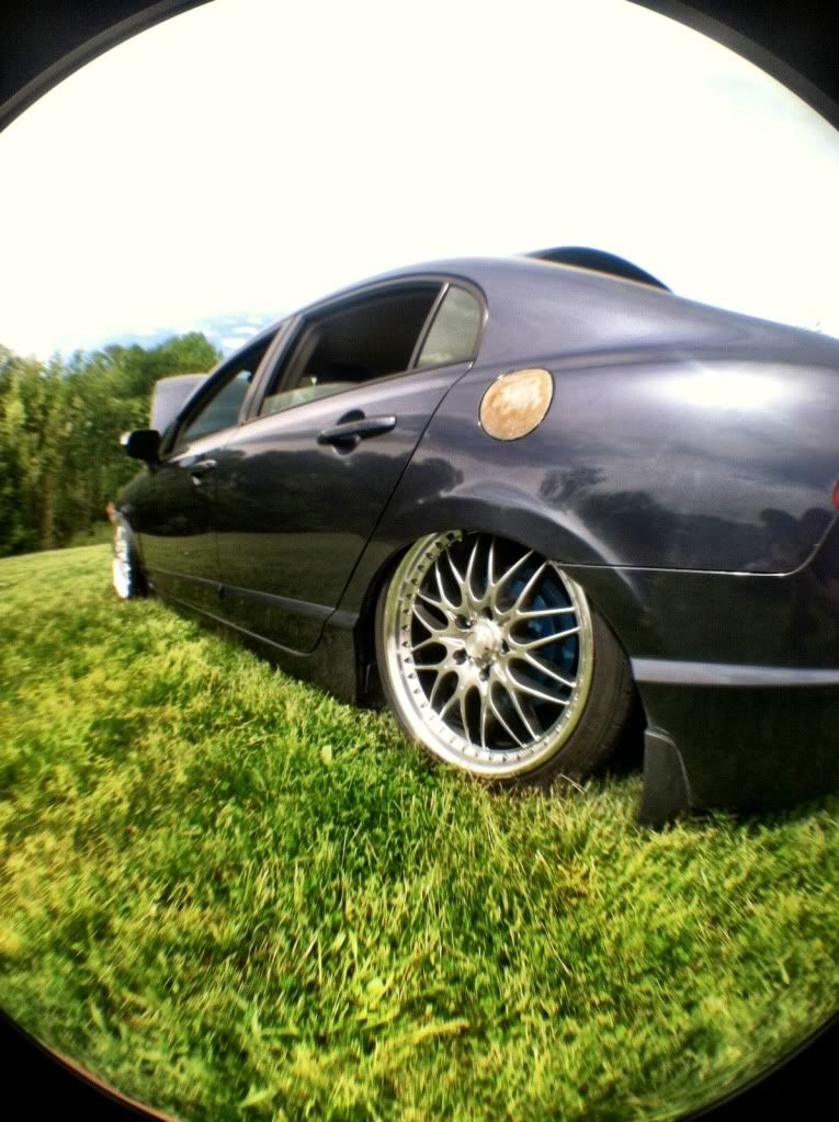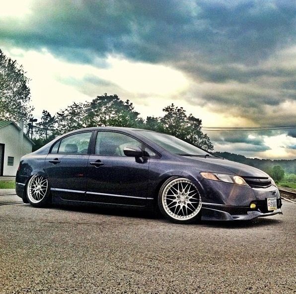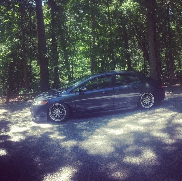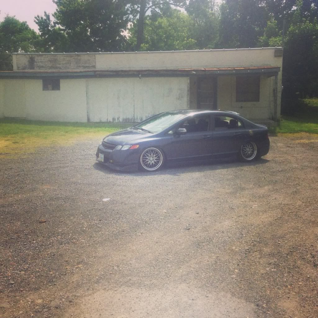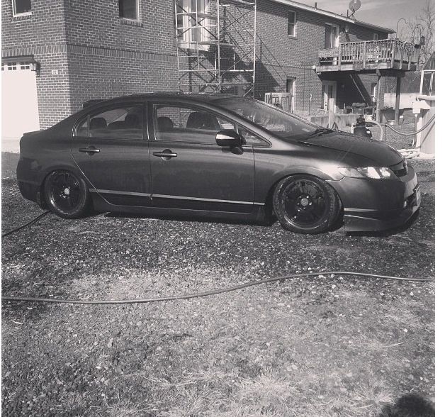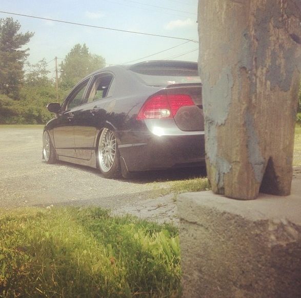Alright I guess it's time to post up my build thread and stop watching other people... I bought a 08 Honda civic hybrid back in 2011 for 12500 and told my parent "this one will stay stock" a week later I blacked out everything lol 2 months later I bought a set of junk2 pro s 2 coilovers from andys auto sport tucked a lil bit of tire then decided to buy a set of rsx type s wheels and paint them white and set the car about a half inch off the ground.. It sucked scraping everywhere I went but it was badass knowing I'm the lowest around and being a hybrid anyhoe I rocked those all last summer then thru my stocks back on for the winter and decided I needed to be more stancy.. So I ended up trading the rsx type s wheels for a set of 18x8.5 konig imagines strait up lol put a set of 215/35s on em and called it a day then came time for air I hit up dorbitz designs for a bag kit for 260 shipped had a air tank 2 480c comps airline and valves from my s10 that I wasn't using and thru it all on 2 days later popped a hole in a bag notched some stuff in the back and went lower and made more room for stuff anyhoe on with the pics