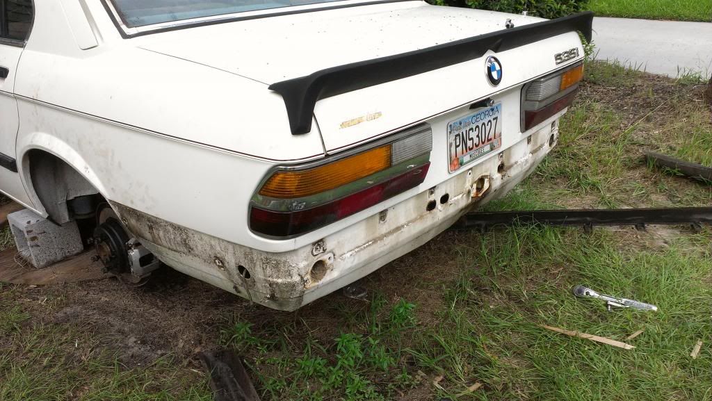 removed old rear bumper, lower rear valence is gonna get shaved of brackets, striped of the old texture paint stuff, holes welded and re-painted before its all done