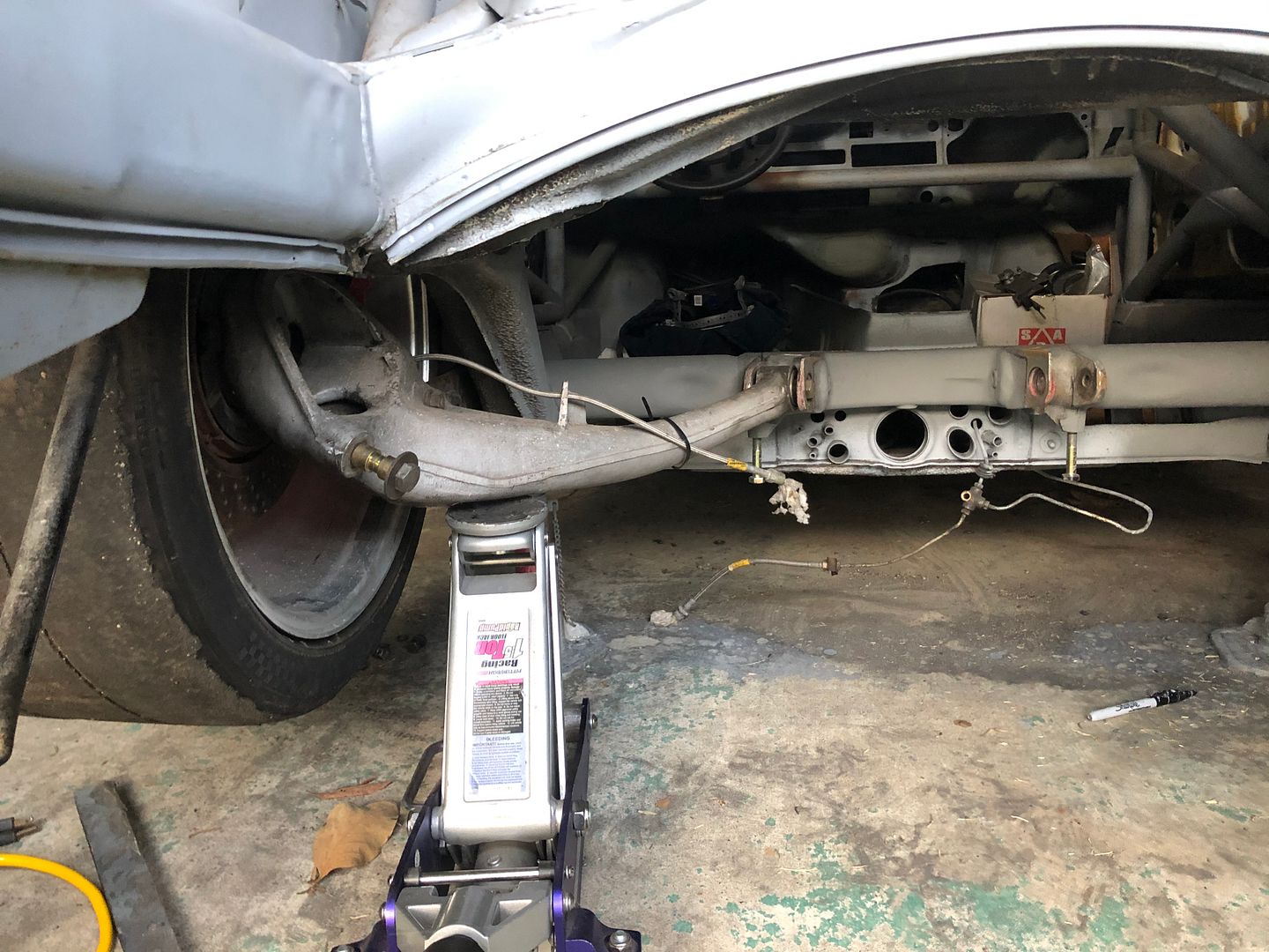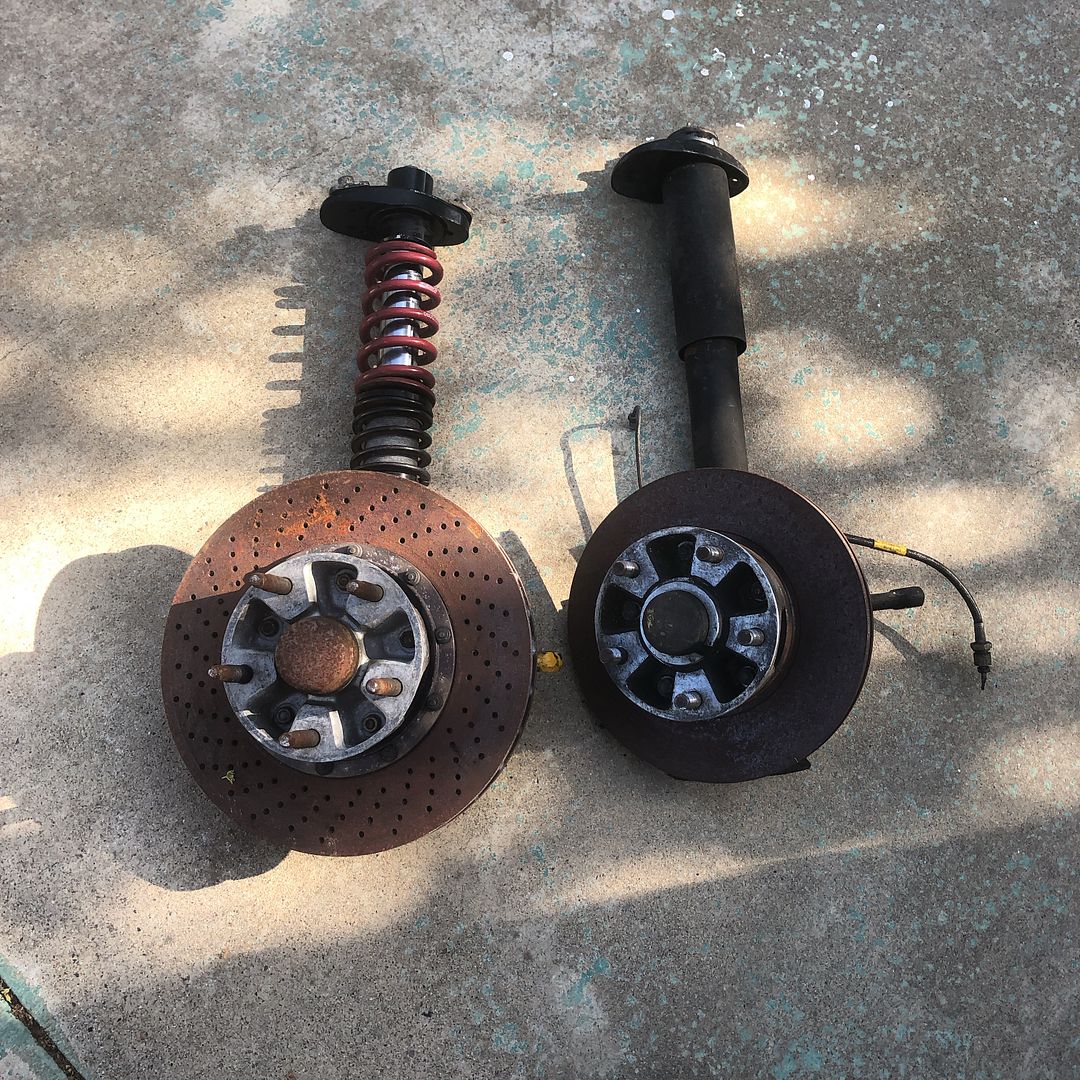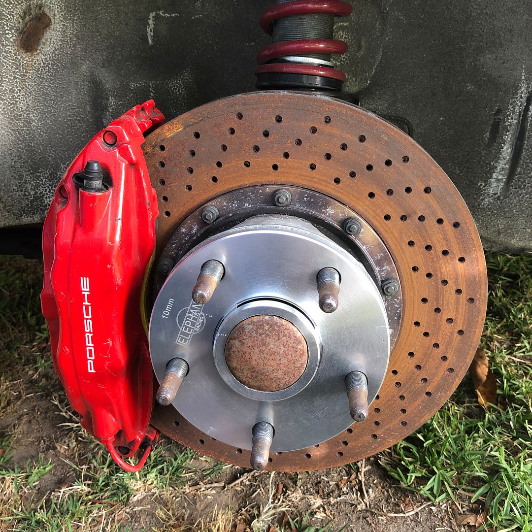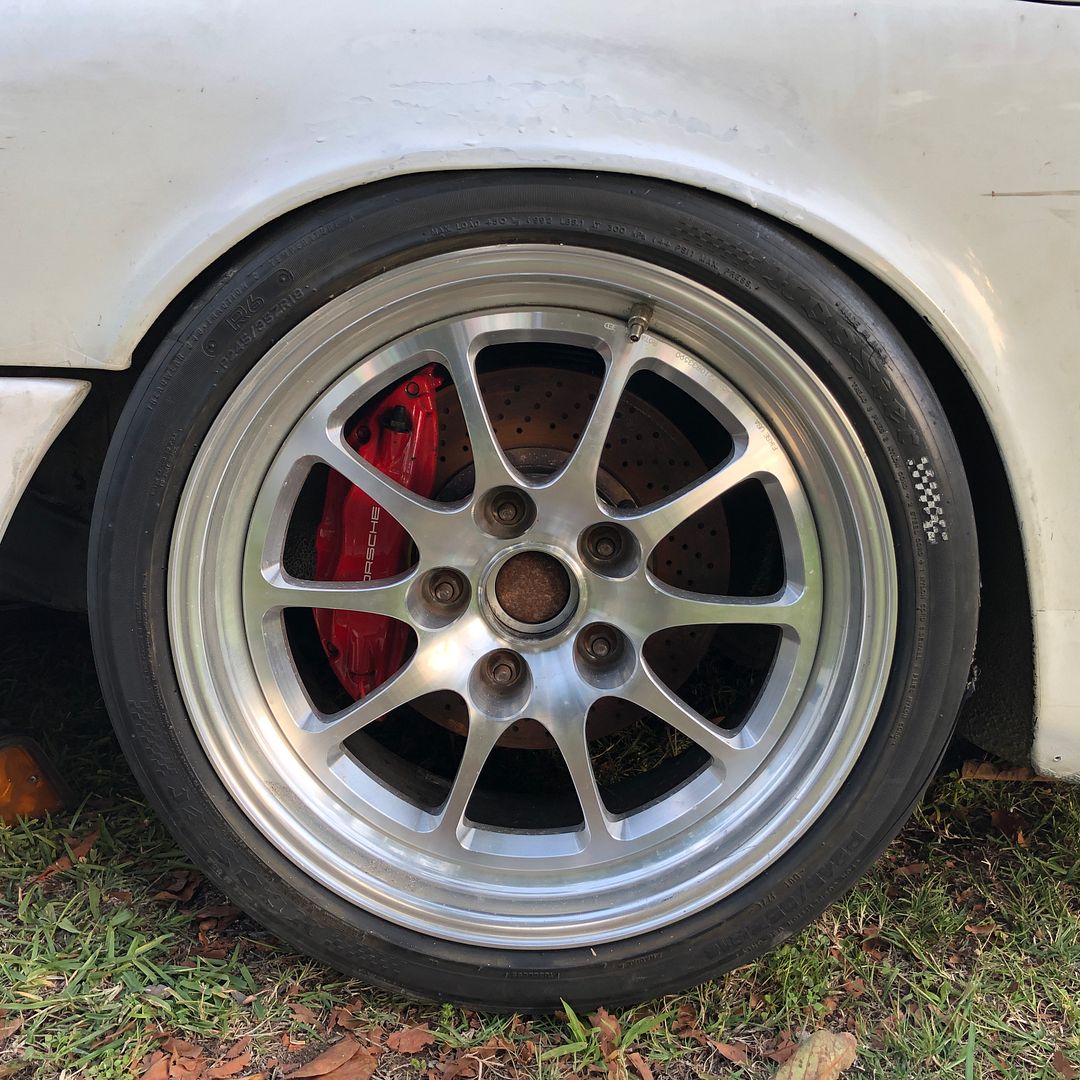 Started fitting up the suspension, brakes and wheels and figuring out what bodywork and cutting will be required to make it fit. 993TT front brakes and an older Brembo GTP rear kit that uses Lotus Esprit calipers on 993TT rear rotors with a bolt on extension for the parking brake. Just a bit bigger then the stock stuff.