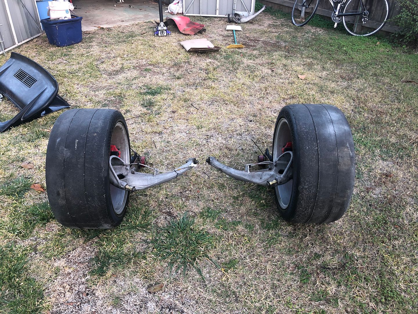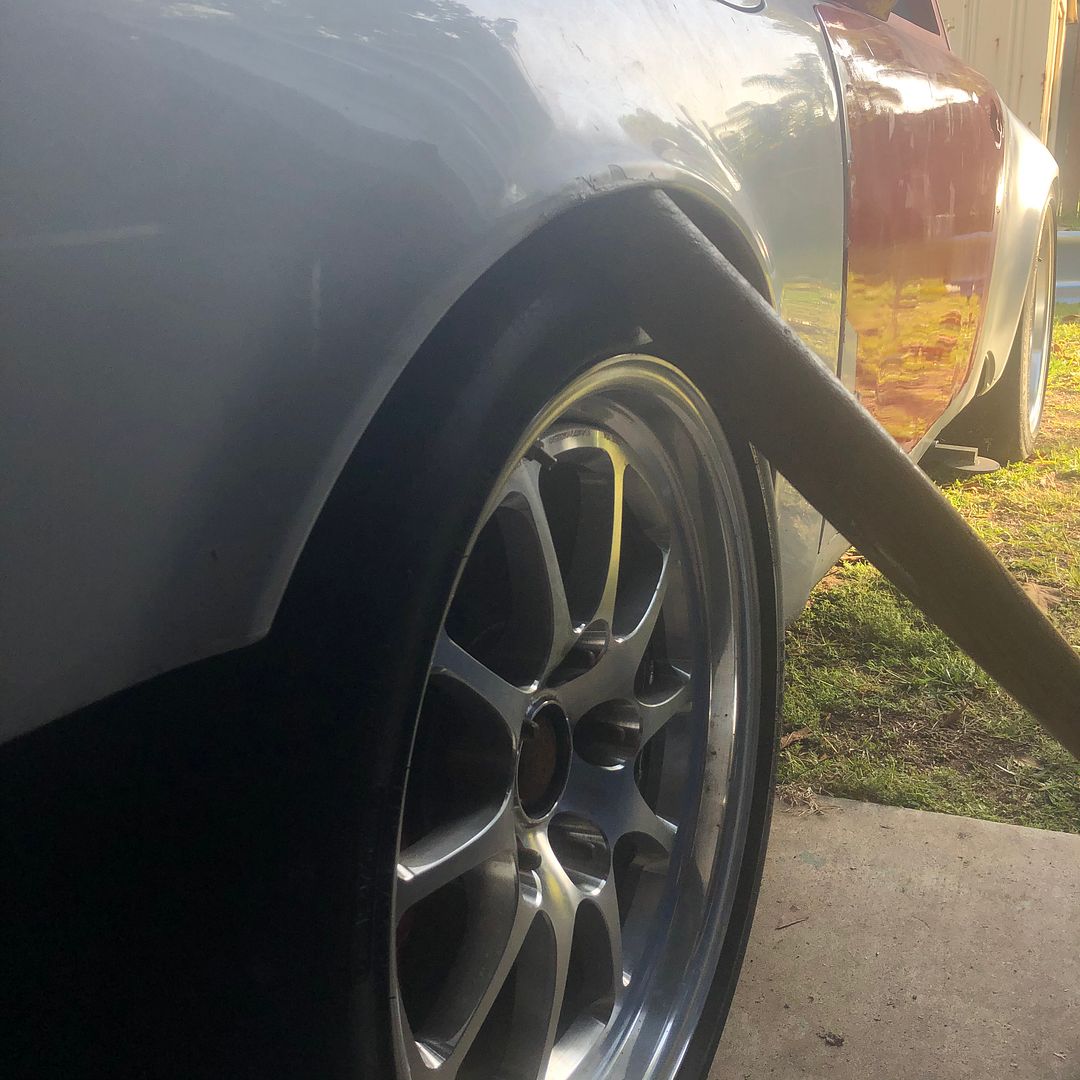 The front struts are raised 30mm with 1.5 degrees decambered into them... which is great but a 8.5" rim with a 245 Hoosier barely will fit in a sorta stock front fender with stock struts. To account for the dacamber and have the tires clear the springs, a 10mm spacer is required...... so the fenders need to be stretched a bit.