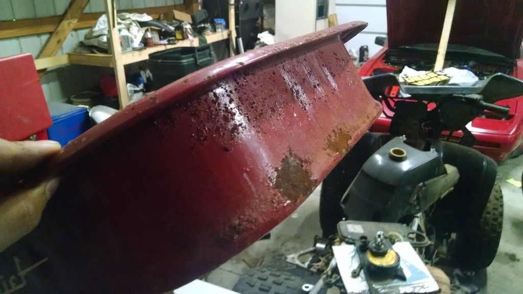 Then I found out I was having a child of my own, so naturally I had to up the game again to make sure my friend'd kids didn't have cooler shit than mine. So first step was finding a donor. I'm not paying $100 for a new one, since I'm throwing half of it out, and these things are surprisingly hard to snag off CL around here, so I spread the word, and eventually my parents called with a barn find. Literally, they were cleaning out an old relatives place and found this guy half buried in the woods behind the barn:
