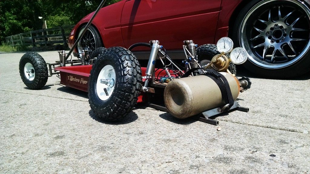 Next came the concept. Since I love me some low, the logical upping of game from the static slam was to go airride on this bitch. Yeah, this has also been done before, but whatever, it's hella cool. I wanted to make sure the thing not only laid frame, but could also pull right, and support the weight of all the on-board hardware plus a kid and at least a small cooler of beer.