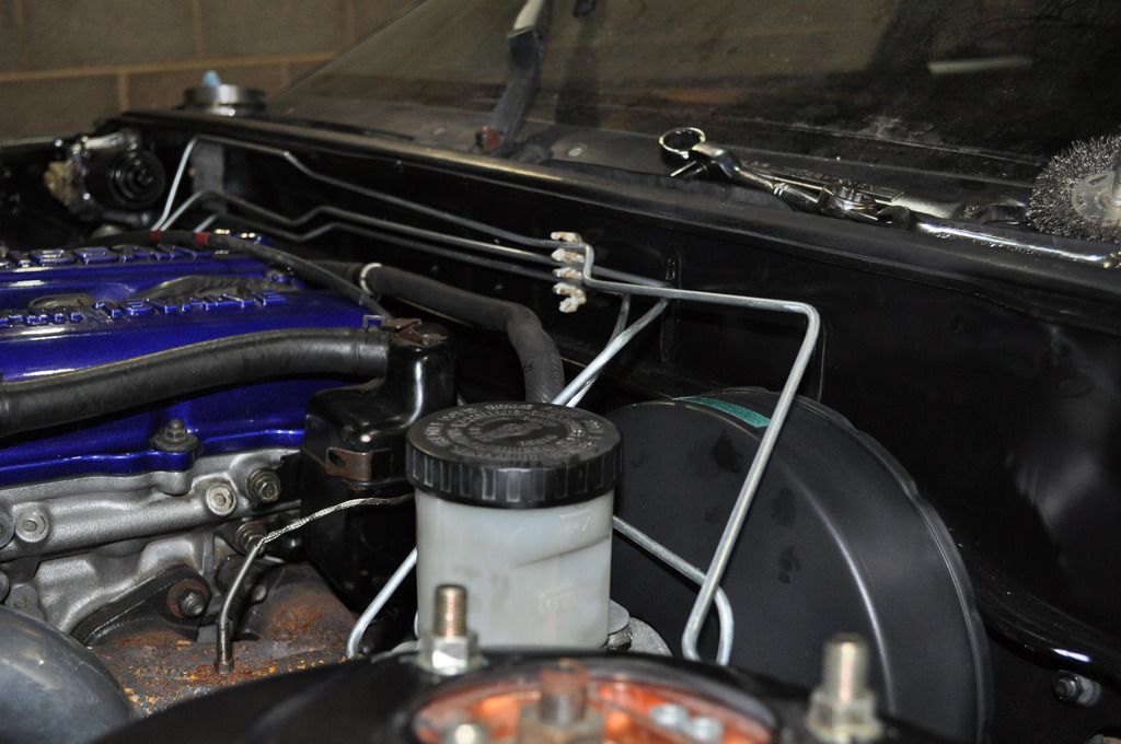 Started putting my brake lines back up after polishing them, they're more of a "brushed" look, but they look way better than the dingy green coated shits they were.