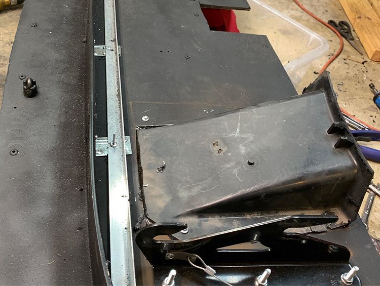 I also installed the diffusers cut from the Chrysler 300 splash shield. They aren't perfectly flat so on each, one side slots under the splitter while the other sits on top. These are held in with more rivets. I left the strip behind them intact to keep the splitter more rigid.