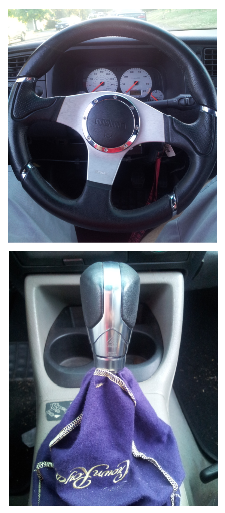 New Momo wheel (traded the wood one) and some off brand shift knob I won at a Car show. I like the feel of both better. The shift know sits lower than the previous one and the Wheel is a smaller diameter and thicker.