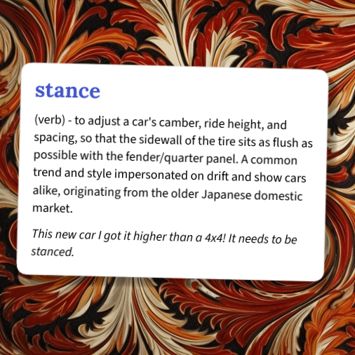 stance: (verb) - to adjust a car's camber, ride height, and spacing, so that the sidewall of the tire sits as flush as possible with the fender/quarter...