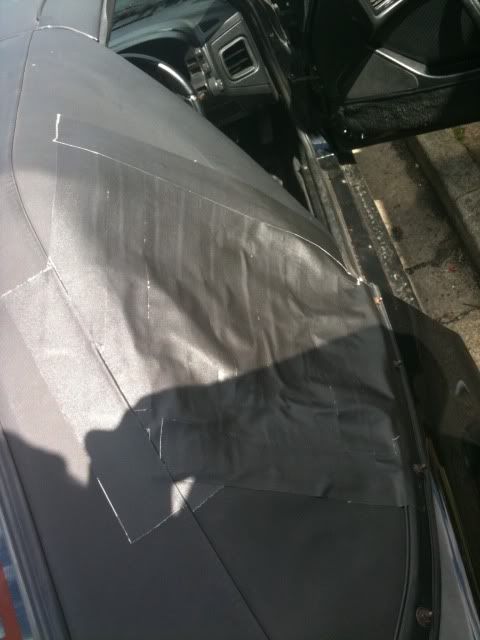 It rained...somewhat epicly last night turning parts of the car into a pond, so this morning decided to do a 'temp' fix to stop water getting in via the holes on the rag top using some flat tape, it looks no worse than before but now at least it will keep water out till I find somewhere that'll retrim it, so cleaned up the water then taped it up