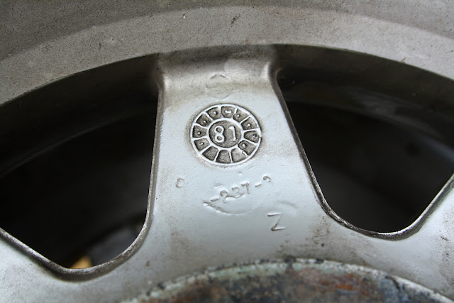 heres the odd one out. shallower cavities, recessed center of mounting surface, different paint color, and no ring inside the hub. almost like its from a different set.